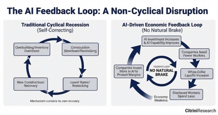 In the AI doom loop, AI improves, fewer workers are needed, fewer workers mean less spending, the economy weakens, companies invest in more AI to protect margins, AI gets even better, and the cycle repeats – there is no natural break.