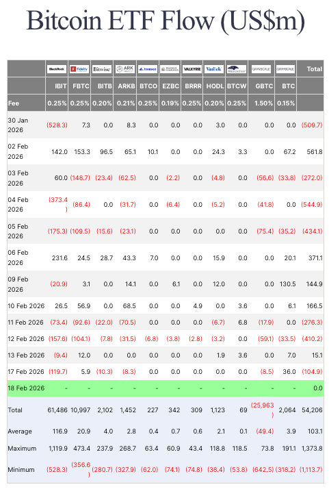 Table showing spot Bitcoin ETF flows from Jan. 30 to Feb. 18, 2026 (Source: Farside)