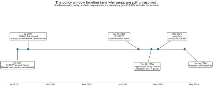 Timeline shows stablecoins gained regulatory clarity through GENIUS Act while CLARITY excludes derivatives, leaving perpetuals unresolved as Treasury pushes spring 2026 deadline.